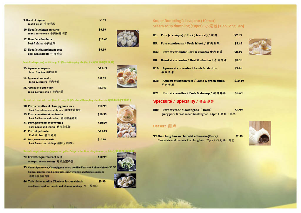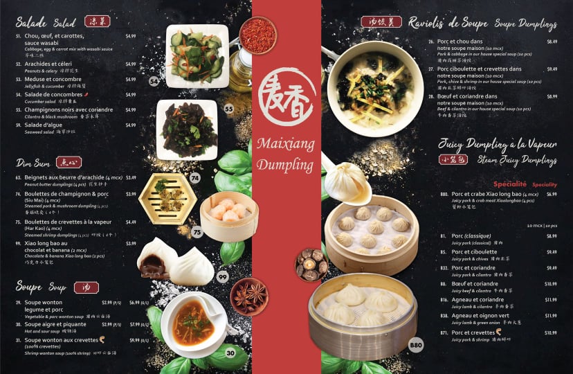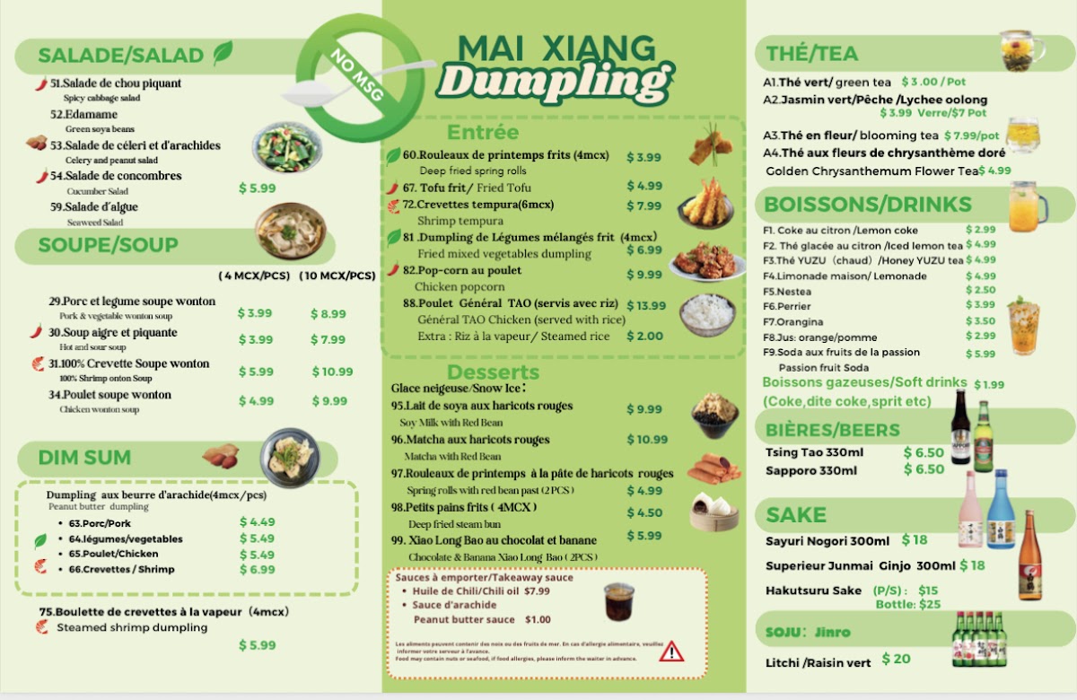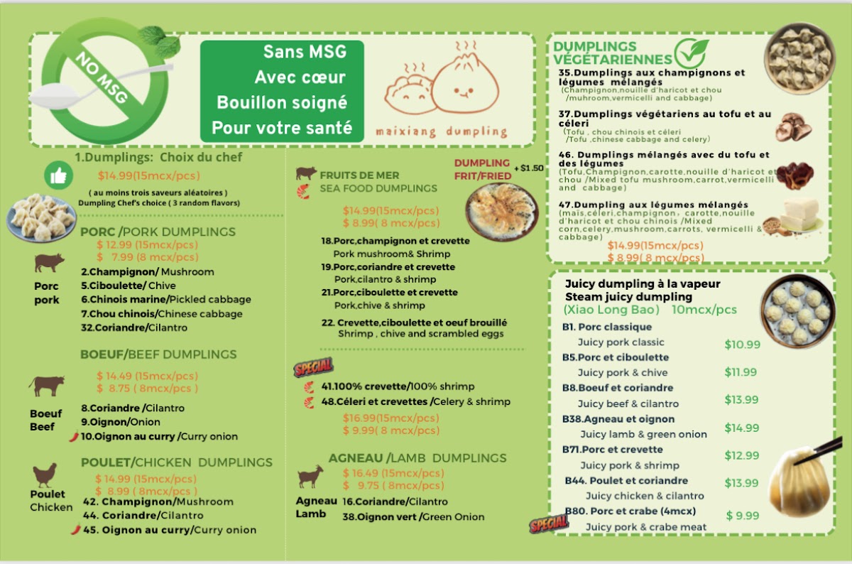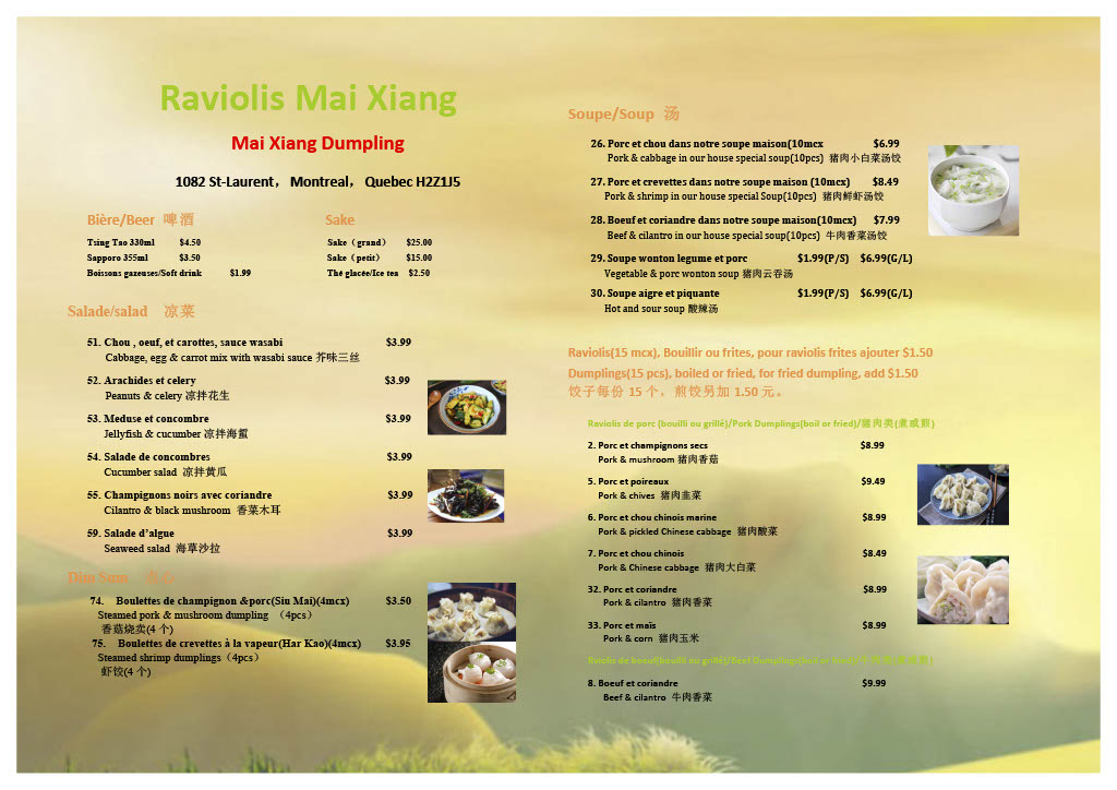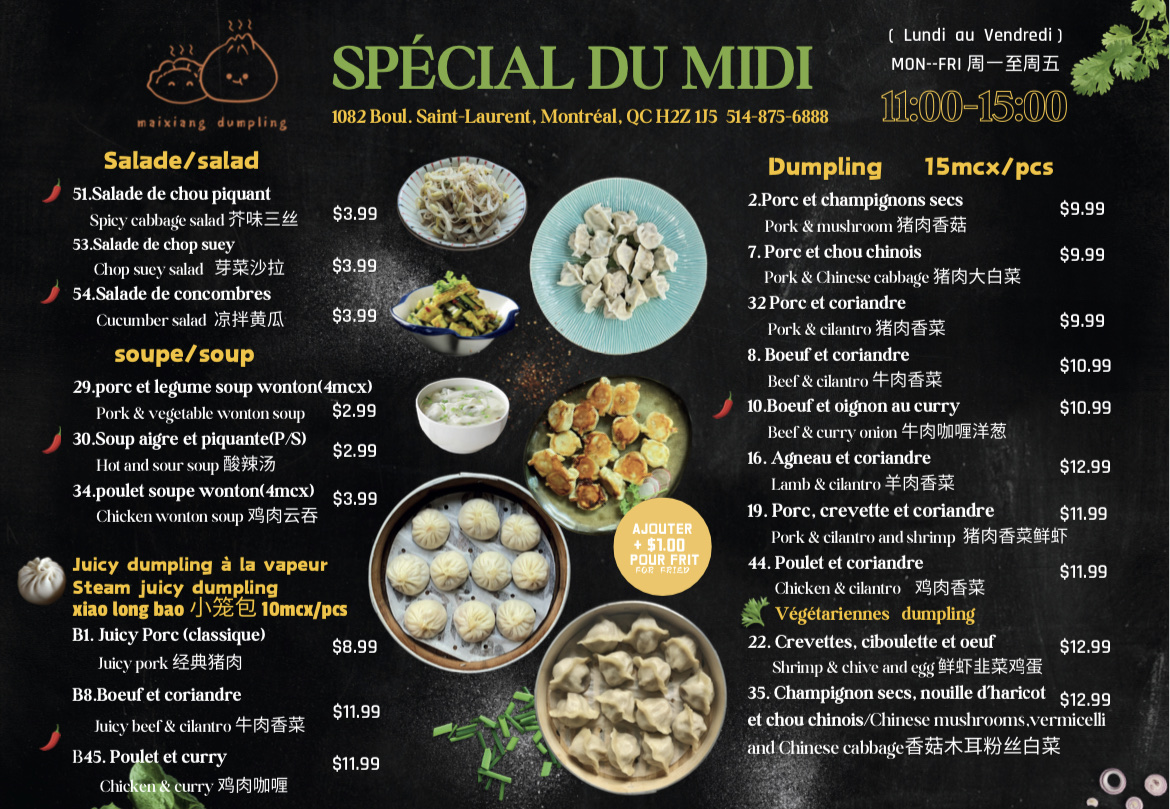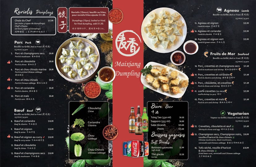 Welcome to Mai Xiang Yuan Dumpling, where each dish is a celebration of authentic flavors and culinary craftsmanship! Nestled at 1082 Boul. Saint-Laurent in the heart of Montréal's Chinatown, our menu is a treasure trove of tantalizing specialties just waiting for you to explore. Savor our perfectly fried dumplings, bursting with flavor, or dive into the comforting warmth of our dumpling soup—both are must-tries! Indulge in unique offerings like the Dumplings Boeuf Et Coriandre and the Fried Beef and Leek Dumplings, each crafted with love and tradition. Don’t forget to refresh your palate with a chilled Cerveza China Tsing Tao or a soothing cup of Thé Vert while you delight in our selection of sides like Salade d'algues. With so many delicious options, from burnt dumplings to savory steamed shrimp variations, we invite you to come and experience the vibrant tastes and textures that make our menu truly special!